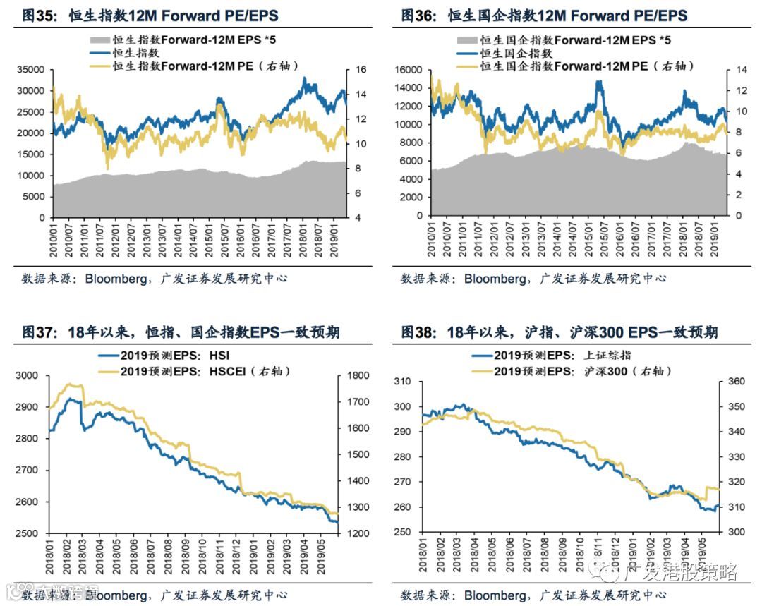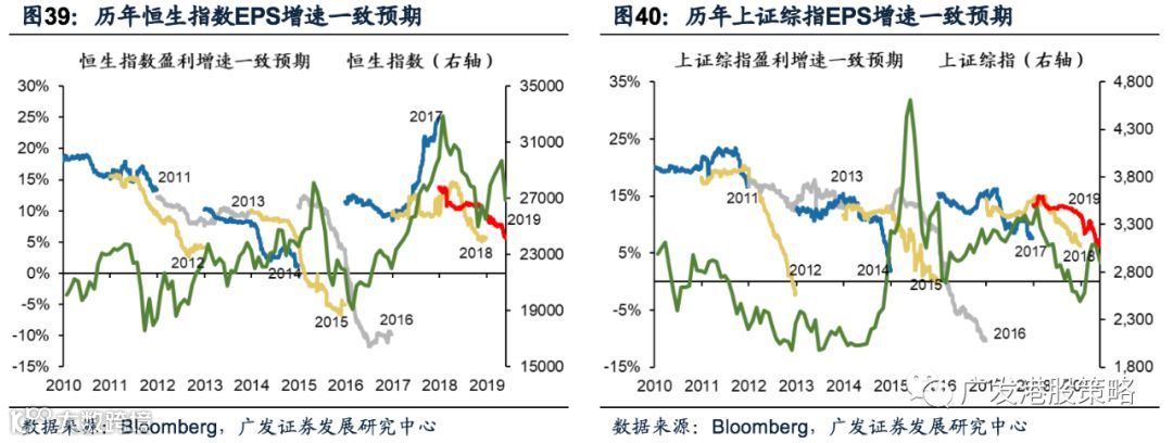 第一,大盘走势与盈利一致预期走势相关度高。恒指和恒生国企指数EPS一致预期历次大的调整均对指数存在重要影响(图39),一个鲜活案例如去年6月-8月;