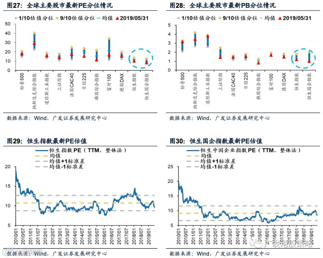 近期,市场对于港股EPS一致预期增速显著下调。市场对港股一致预期EPS受到经济名义增长和信用环境影响,19Q1的经济“韧性”和信用扩张支撑盈利预期高“韧性”。但5月初以来的中美贸易环境恶化带来出口链和制造业投资的增长变数,加上央行转向既有“底线”、又保持“定力”的政策基调,使得“经济底”的时点后移,也压低了恒指和国企指数EPS一致预期,最新市场对19年恒指EPS增速预期为6.9%,较年初的超过10%的预测有所下调(图37)。
