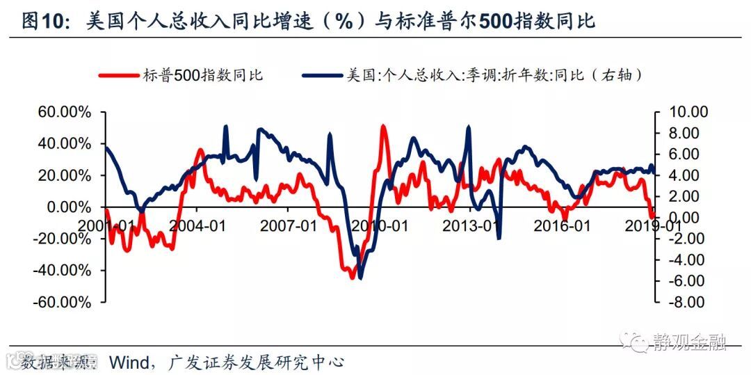 路径一:美债利差通过经济领先指标影响投资者信心及股市,进而影响居民收入和消费。美国比较重要的两个经济领先指标——OECD综合领先指标[1](compositeleading indicator,简写CLI)和经济领先指标[2](leading economic index,简写LEI)——的构成因子中均包含美债利差。图8-9所示,每当美债利差倒挂,LEI和CLI立即出现大幅下滑。关键性领先指标快速下滑大概率会导致投资者信心骤降,进而减持股票等风险资产。目前美国居民资产中金融资产占比高达70%,根据我们的估算美股同比每下滑10%,将掣肘2个季度后美国个人收入增速1个百分点。