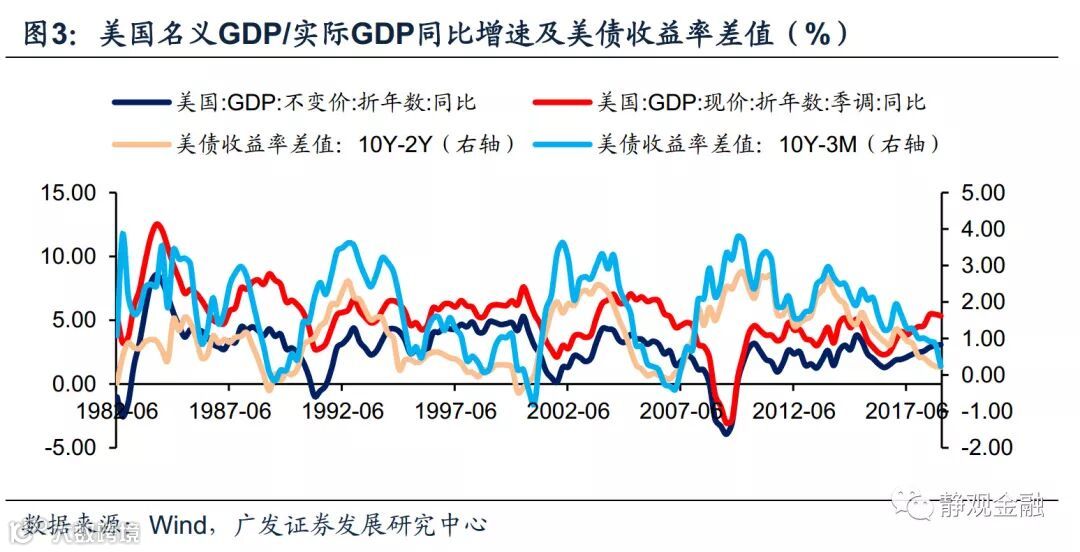 若将衰退严格定义为实际GDP同比增速(或者环比折年率)连续两个季度为负,那么利差倒挂未必一定带来美国经济衰退。如图2所示,尽管1998-2000年间美国利率曲线曾两度倒挂,但2001年4Q美国实际GDP同比增速低点为0.15%,仍处于正增长水平;即便用环比折年率评估,2001年美国也并未出现连续两个季度环比折年率为负的情况。我们认为,美国经济衰退会伴随着利差曲线倒挂,但利差曲线倒挂后未必出现经济衰退。