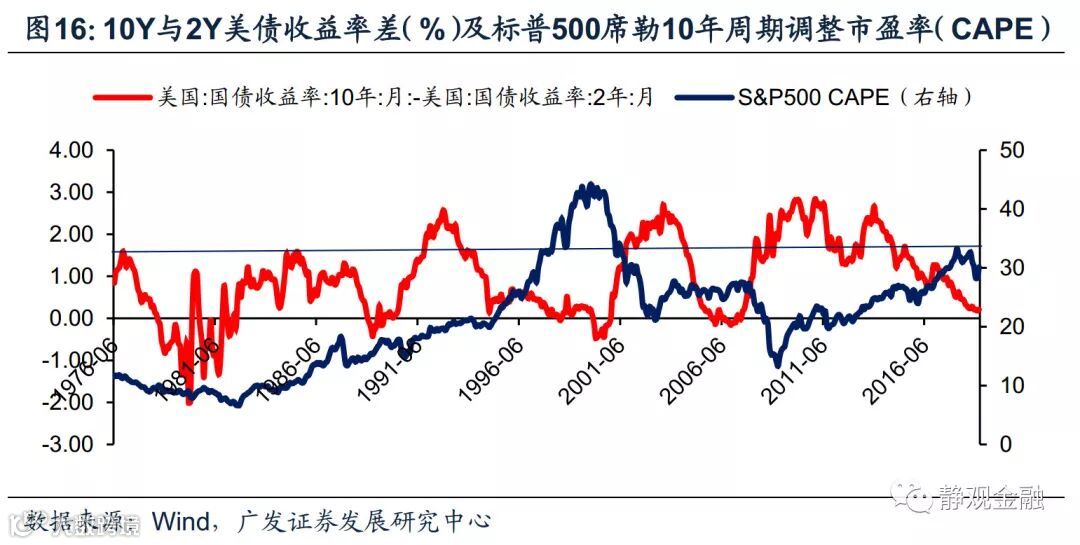 目前10年期与3个月期限美债收益率已经倒挂,10年期与2年期美债收益率差值只有13BP,不排除倒挂可能。基于前文,这种状况将对市场信心产生负面影响,因此此间美股表现大概率偏弱。图14所示,90年代以来每一轮美债长短端利率倒挂后,美股都迎来了大幅调整。且由图15所示,在美国长短端利差倒挂后美股下挫过程中,也伴随着美股估值的调整。