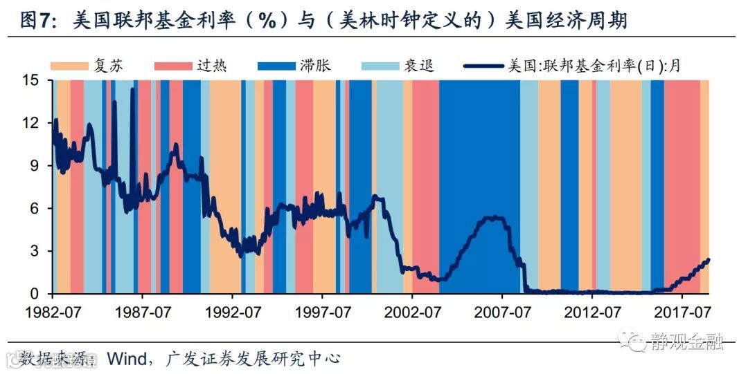 一切经济周期与利率期限结构的矛盾都可以通过图6解释。金融危机前美国的“牛陡”基本对应美联储降息周期、“熊平”基本对应美联储加息周期,而美联储货币政策空窗期(非加息或降息阶段)美国利率期限结构往往对应“牛平”和“熊陡”;金融危机后,美联储较少动用利率工具,同时“牛陡”结构也比较罕见。结合图7,美联储加息周期启动于经济复苏中后期到经济过热初期、贯穿经济过热到滞胀期;降息启动于滞胀后期到经济衰退期,也有可能持续到经济复苏初期。