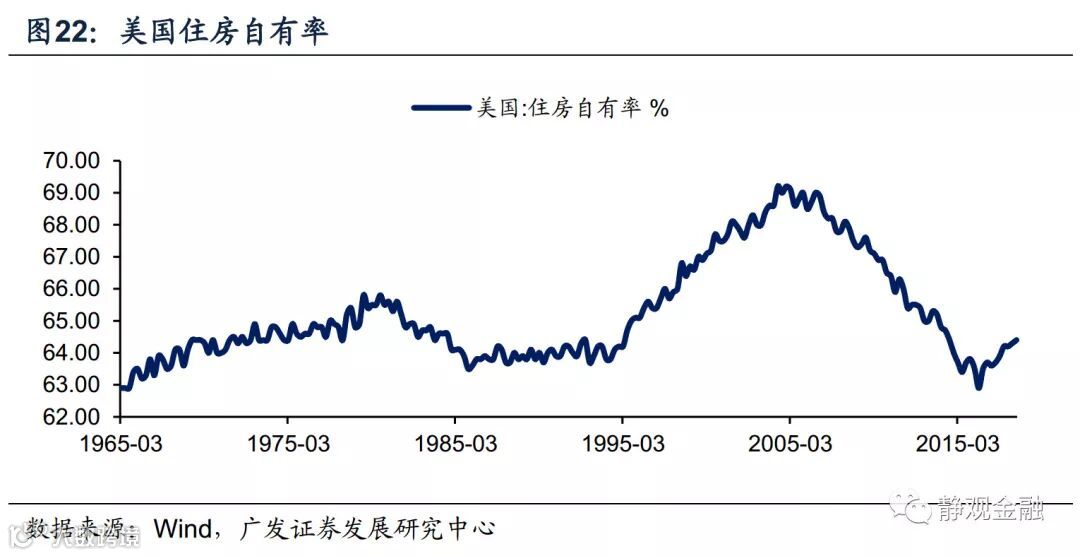 第二、美股与美国房价指数的比值呈现长周期波动特征。图21所示,2018年以来美股与美国房价指数比值接近2000年的高点水平,与之对应的是目前美国居民部门持有的金融资产占比也处于历史极高水平。相反,目前美国住房自有率(图22)和居民杠杆率均为近20年的较低水平。换言之,若美联储再度放松货币政策,与美股相比,房地产或更具吸引力。