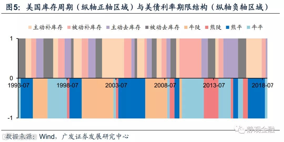 假若把美林时钟经济周期改为库存周期,逻辑上:主动补库存类似经济过热,应该对应“熊陡”;被动补库存类似经济滞胀,应该对应“熊平”;主动去库存类似经济衰退,应该对应“牛平”;被动去库存类似经济复苏,应该对应“牛陡”。但图5所示,美国库存周期与利率期限结构相匹配的阶段也并不多。