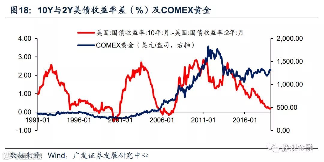 影响二:市场风险偏好阶段性变差,美债受益。前两轮美债收益率曲线倒挂后市场风险偏好均转差,同期美债收益率走低,但黄金和美元指数表现并不稳定。