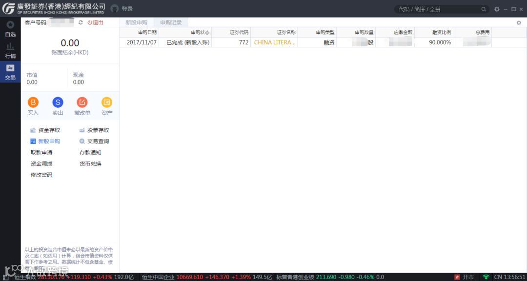 进入“广发证券国际版”PC端,点击左边“交易”菜单,再点击交易菜单页内的“新股申购”,如下图,在右边跳出“新股申购/申购记录”栏、“新股列表”栏、“招股详情”栏。(注意:每只新股都有个“网上现金申请截止日期”,这个日期是我司线上最迟接受申购日期,请客户务必在此日期之前申购进行网上申购)