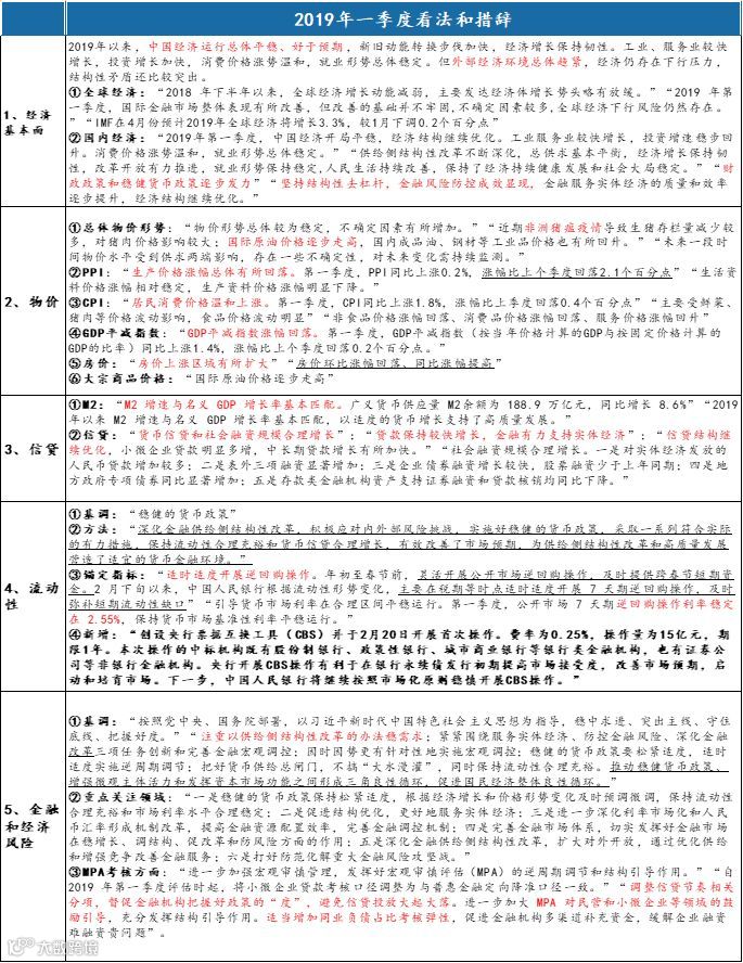 对于经济形势,央行延续了政治局会议“总体平稳”和“下行压力”并提的定调。“外部环境总体趋紧”的提法取代了四季度的“不确定性增多”,同时指出“货币政策应对空间充足、工具箱丰富,有能力应对各种内外部不确定性”。央行在一季度货币政策执行报告中指出“2019年第一季度宏观经济指标保持在合理区间,市场信心提升”、“经济运行总体平稳、好于预期”。外部因素方面,四季度货币政策执行报告表述是“外部环境发生明显变化,不确定因素增多”;本季货币政策执行报告更为明确地指出“外部经济环境总体趋紧,经济存在下行压力”。央行同时指出“货币政策应对空间充足、货币政策工具箱丰富,有能力应对各种内外部不确定性”。