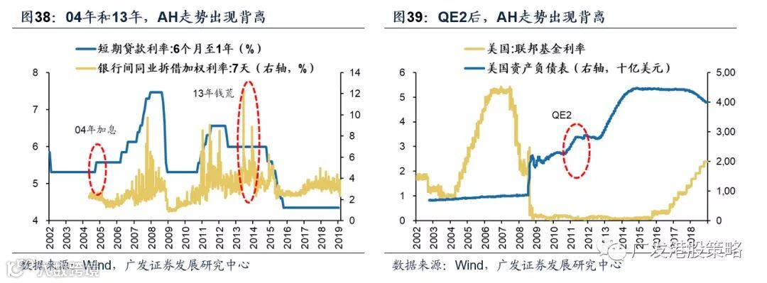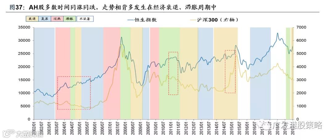 我们复盘了2002年以来的中国经济周期与AH市场指数之间的相对表现,恒生指数和沪深300指数多数时间同涨同跌,但在经济衰退和滞胀周期中,两者的相对存在一定差异。这可能与国内外货币政策和产业政策环境的显著变化有关,代表性案例包括:04年(加息)、13年(钱荒)、11年(美国QE)、15年(杠杆牛)等。
