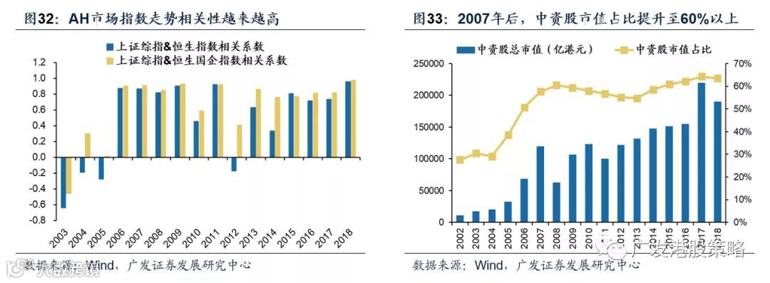 近年来,随着互联互通机制的推进,尤其是2016年底深港通开通以来,AH市场之间的联动性显著增强,恒生指数和上证指数走势之间的相关性越来越高。
