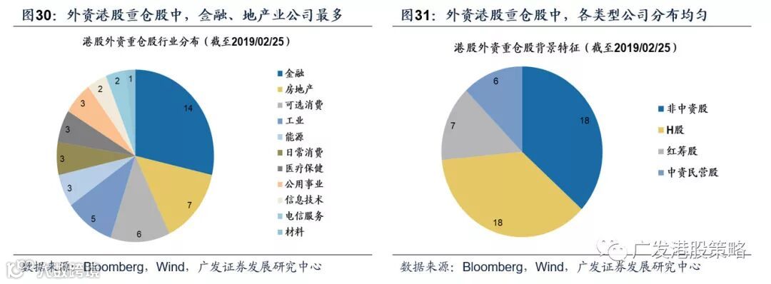 第一,行业方面,外资港股重仓股中金融、地产、消费行业公司占比较高,而原材料行业仅1家公司为外资重仓;