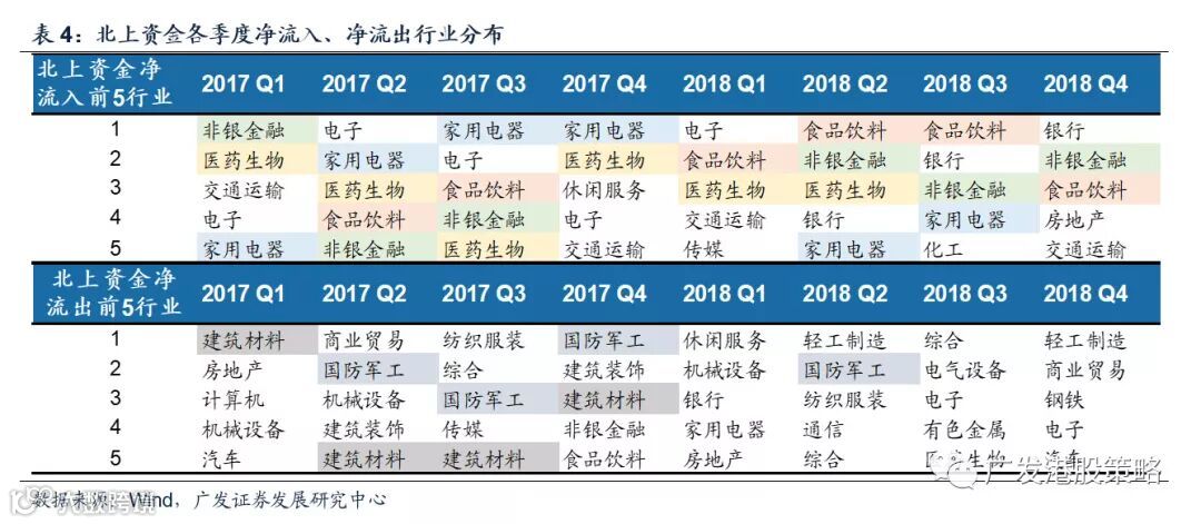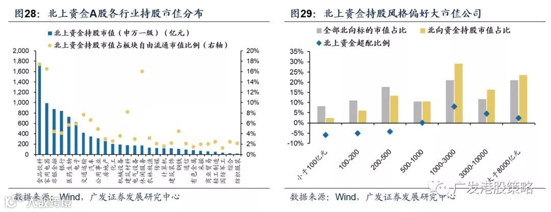 和外资在韩国/中国台湾股市的持股相比,北上资金持股风格同样偏好大市值、高ROE、高流动性的行业龙头,但在行业分布上略有差异——17年以来北上资金净流入较多的行业集中在食品饮料、家用电器、非银金融和医药生物,最新持股市值占自由流通市值比例较高的行业包括食品饮料、家电、医药生物和电子。