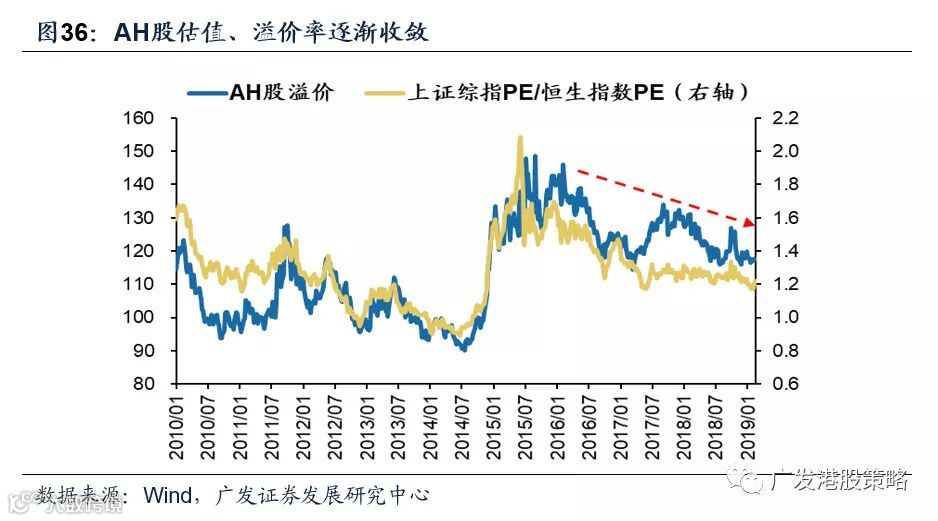 第二,A股和港股两者的估值体系也越来越接近。AH市场互联互通,加速了两地市场相对估值从发散到收敛的进程,A股相对港股的估值溢价在收窄。
