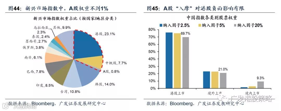 A股纳入因子提高短期内将分流港股资金,但影响有限。目前A股纳入MSCI因子仅为5%,在新兴市场指数中权重不到1%,未来随着A股纳入因子的提升,港股市场投资者担心港股权重将被稀释,导致资金流出。我们认为,A股纳入因子提升短期内对港股存在一定冲击,但影响可控。以MSCI中国指数为例,若A股纳入因子提升至20%,港股权重仅降低约5%,且由于调整分阶段进行,负面影响整体可控。