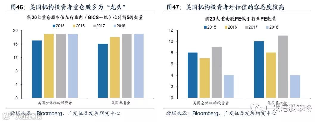 美国机构投资者偏好大市值“龙头”,对估值的容忍度更高。美国机构投资者重仓股多为行业“龙头公司”,但由于海外龙头股大多存在“估值溢价”,且较多机构重仓的美股科技股估值更高,因此整体来看,美国机构投资者偏爱低估值的特征并不明显。