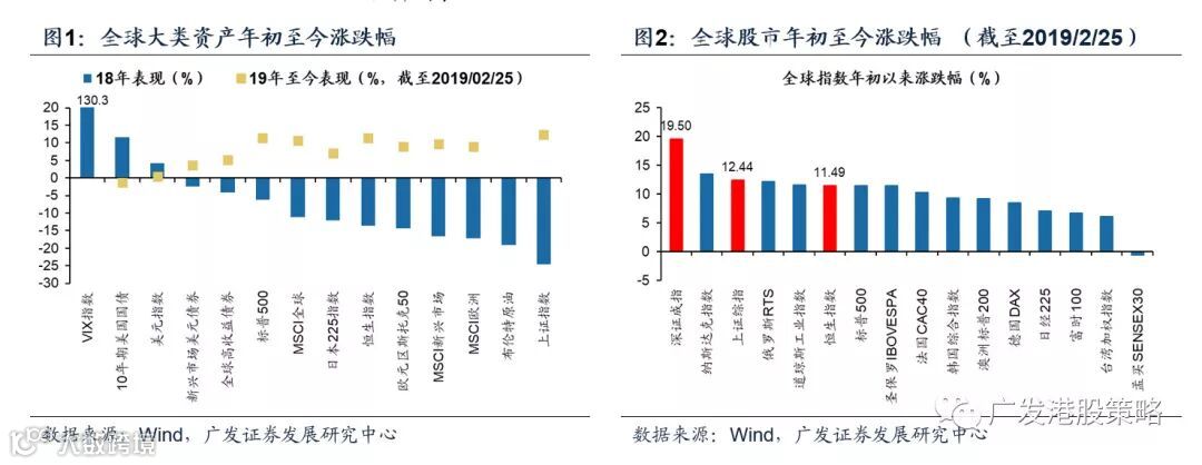 第一,19年初以来,全球主要央行货币政策态度相继转为更加的“鸽派”,推动包括新兴市场在内的全球债券收益率同步下行,市场估值得到支撑;