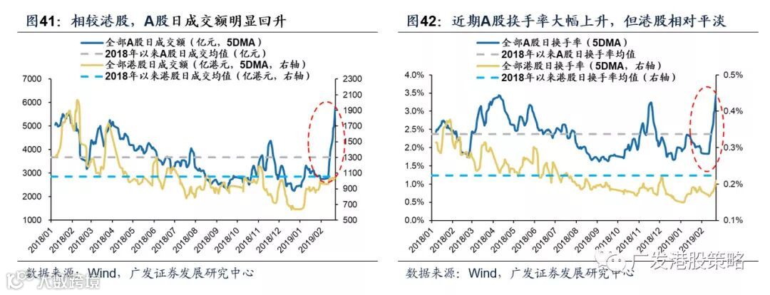 我们认为,本轮经济下行和政策逆周期对冲周期,A股表现可能略优于港股,对外资的吸引力可能更高。当前阶段处于一轮经济增速和PPI周期下行的压力期,逆周期对冲政策(全面降准、TMLF、创设CBS、产业政策等)不断发力,AH市场风险偏好同时受到支撑。但相比港股,A股对逆周期对冲政策的敏感程度更高,从政策加速后的日成交金额和换手率情况可以加以验证(参考前期报告《降准与AH市场:短期受益,程度各异》,2019-1-6;《纾困政策下,AH市场交易行为差异》,2018-11-18)。