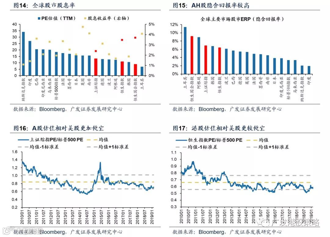 2011年以来,新兴市场股市多跑输,最新相对发达市场PE折价达26%;而新兴市场中,AH指数估值更低,无论PE、股息率还是隐含的回报率,均优于全球大部分股市,相比美股的估值也处于历史下限附近,其中A股相对美股的估值折价更为显著。