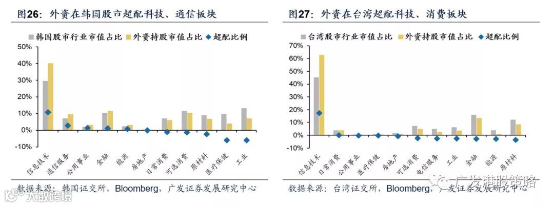 超配行业方面,外资在韩国股市超配科技、通信服务板块,在台湾股市则更多超配科技和日常消费板块,其中科技板块均为两地股市市值占比较高的行业;