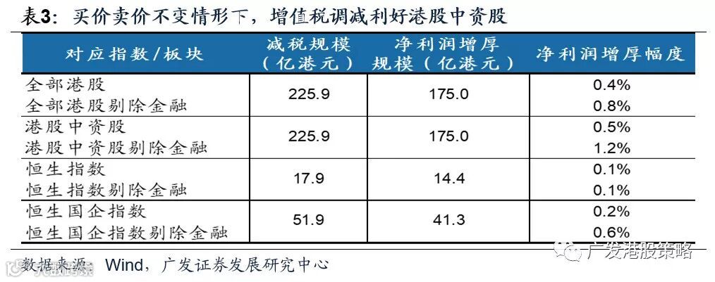 考虑“买卖价”不变情形,增值税下调对全部港股净利润提升幅度约0.4%;若只考虑中资股,减税对净利润的增厚约0.8%。