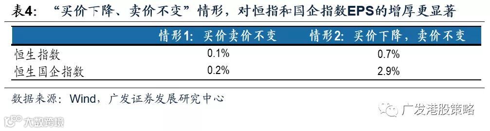 在“买价下降、卖价不变”的情形下,对恒生指数和恒生国企指数的贡献要高,恒生指数净利润增厚约0.7%,国企指数净利润增厚约2.9%。