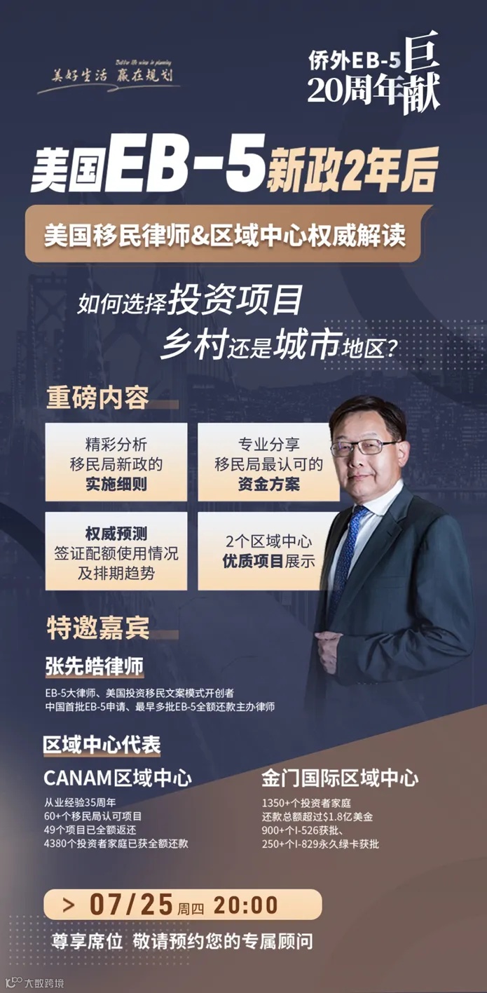 7月25日,侨外出国将举办EB-5相关线上讲座活动,特邀三十年从业经验的美国移民资深律师,为大家权威解读签证配额的使用情况和排期预测,分析移民局新政的实施细则,并就投资者选择投资项目给出中肯建议。干货满满,精彩不容错过,有兴趣的朋友,快联系您的专属顾问客服锁定参与名额吧!