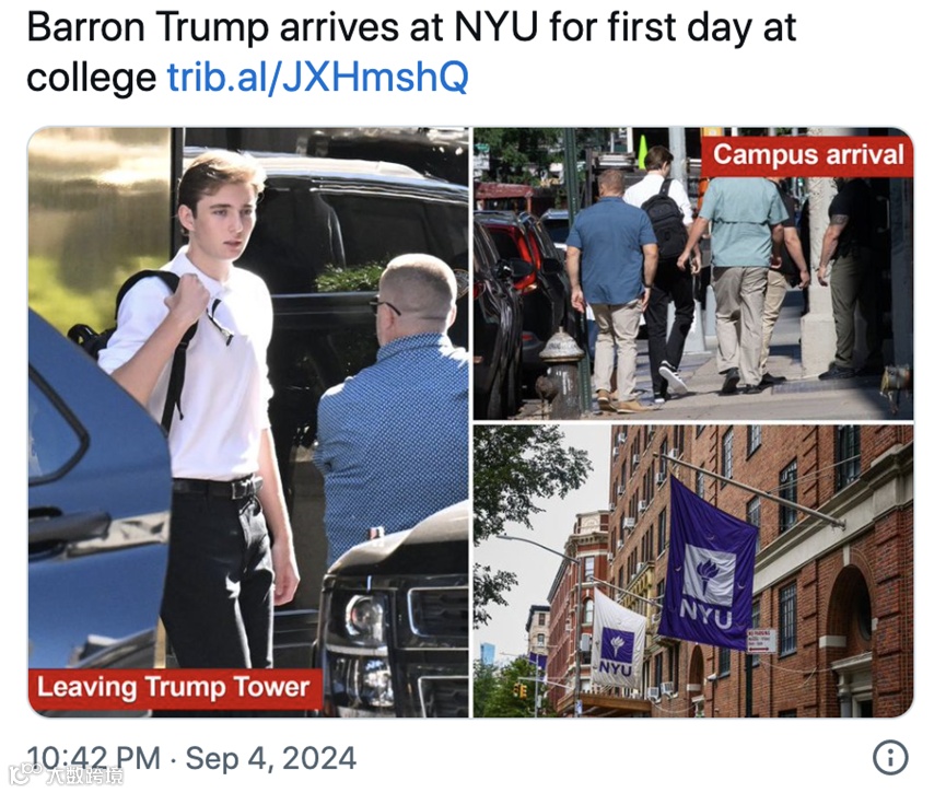 美国前总统唐纳德·特朗普的小儿子巴伦·特朗普(Barron Trump),被拍到在专人护送下前往纽约大学斯特恩商学院,开启他的大学生涯。