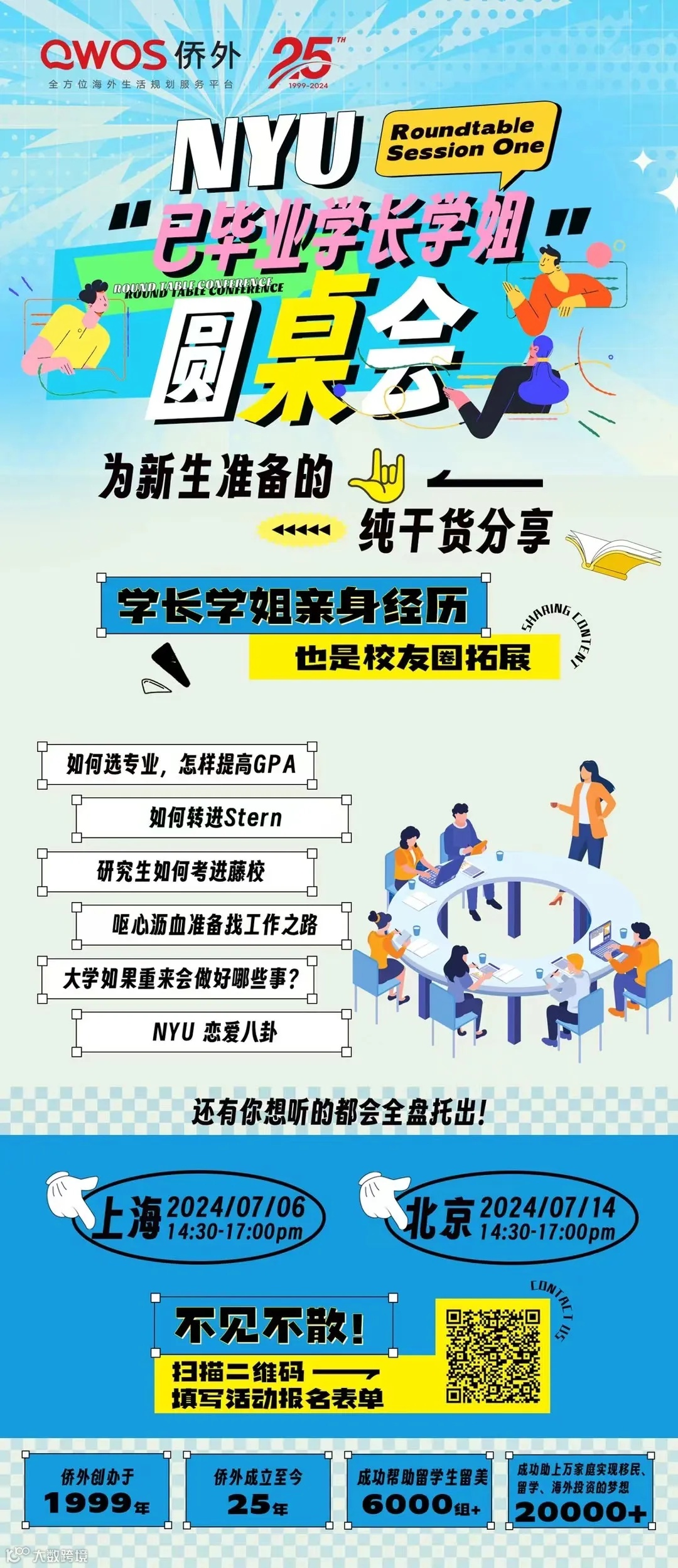 侨外出国也将于7 月 6 日在上海、7 月 14 日在北京举办两场“纽约大学学长学姐圆桌会”活动,特邀多位纽约大学毕业的杰出学长学姐们,为大学新人们毫无保留地分享他们在美国生活、学习以及求职等方面的宝贵经验。干货满满,不容错过,有兴趣的朋友,快联系您的侨外客服、顾问报名参加吧!