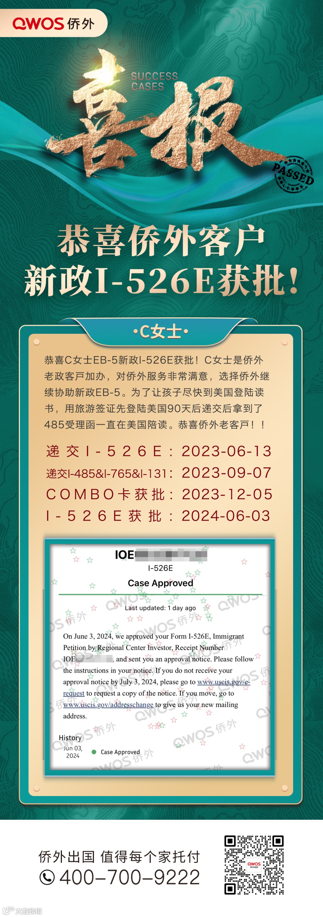 侨外美国移民专家表示,从C女士递交申请到成功获批 I-526E,整个过程用时还不到一年,这再次证实了侨外团队的专业能力和高效运作。这也表明在当前的政策环境下,只要准备充分、操作得当,移民美国的梦想可以更快地实现。