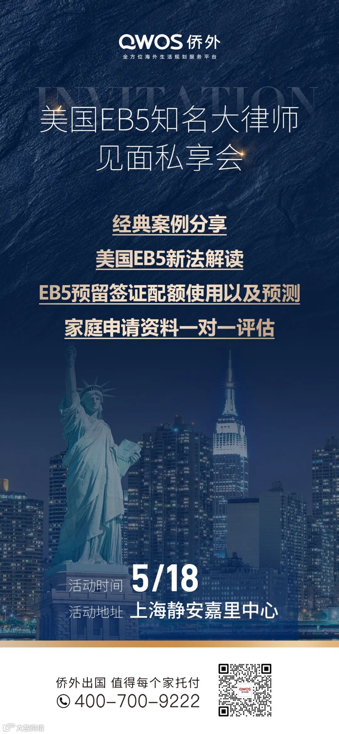 5月18日,侨外出国将举办“美国EB-5项目私享会”活动,邀您与EB5资深律师一对一沟通,深入了解 EB-5 项目的最新政策和发展趋势,为您提供专业的建议和指导。名额有限,先到先得,快快扫描下方二维码锁定与会资格吧!