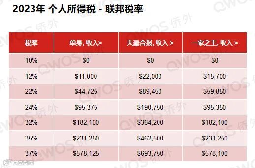 个人所得税是美国税收的大头,美国采用的是累进分级税率制度。个人联邦所得税税率在10%-37%之间,且因收入高低或是不同报税身份(比如单身、已婚夫妻分开报税、已婚夫妻合并报税等)而调整,详情见下表: