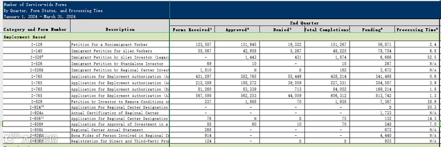 从上表的数据可以看出,在24财年的第二季度,移民局总共收到了69份直投I-526以及1810份区域中心I-526E,两者相加共计1879份。通过计算可知,平均每个月的申请数量约为626份。这创下了EB-5新法实施以来的最高记录。