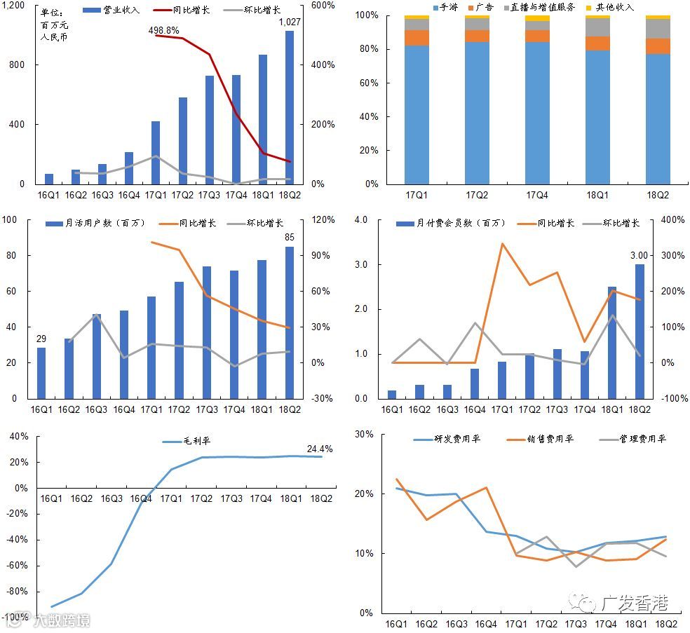 1、全业务线发力贡献净收入增长。18Q2净收入总额达10.265亿元人民币(合1.551亿美元),同比增长76%。其中手游(YoY+61%)、直播增值服务(+186% YoY)、广告(+132% YoY)。