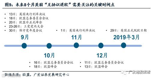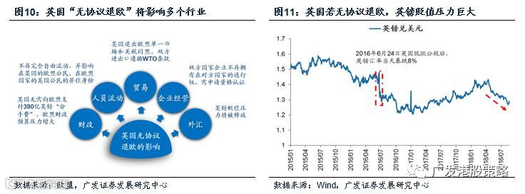 若出现“硬脱欧”,将影响多个行业,英镑将面临贬值压力。一旦“无协议退欧”成为现实,英国将无需支付2019年二季度至2020年共7个季度的欧盟财政预算,但同时双边贸易与人员流动将受到较大影响。此外,英国无协议退欧将使外汇市场产生较大波动。参考2016年英国脱欧公投当日,英镑兑美元汇率单日贬值8%;而从今年4月开始,在谈判没有进展的情况下,英镑兑美元汇率已开始走低。若最终“无协议退欧”成为现实,英镑兑美元的贬值压力将进一步释放。