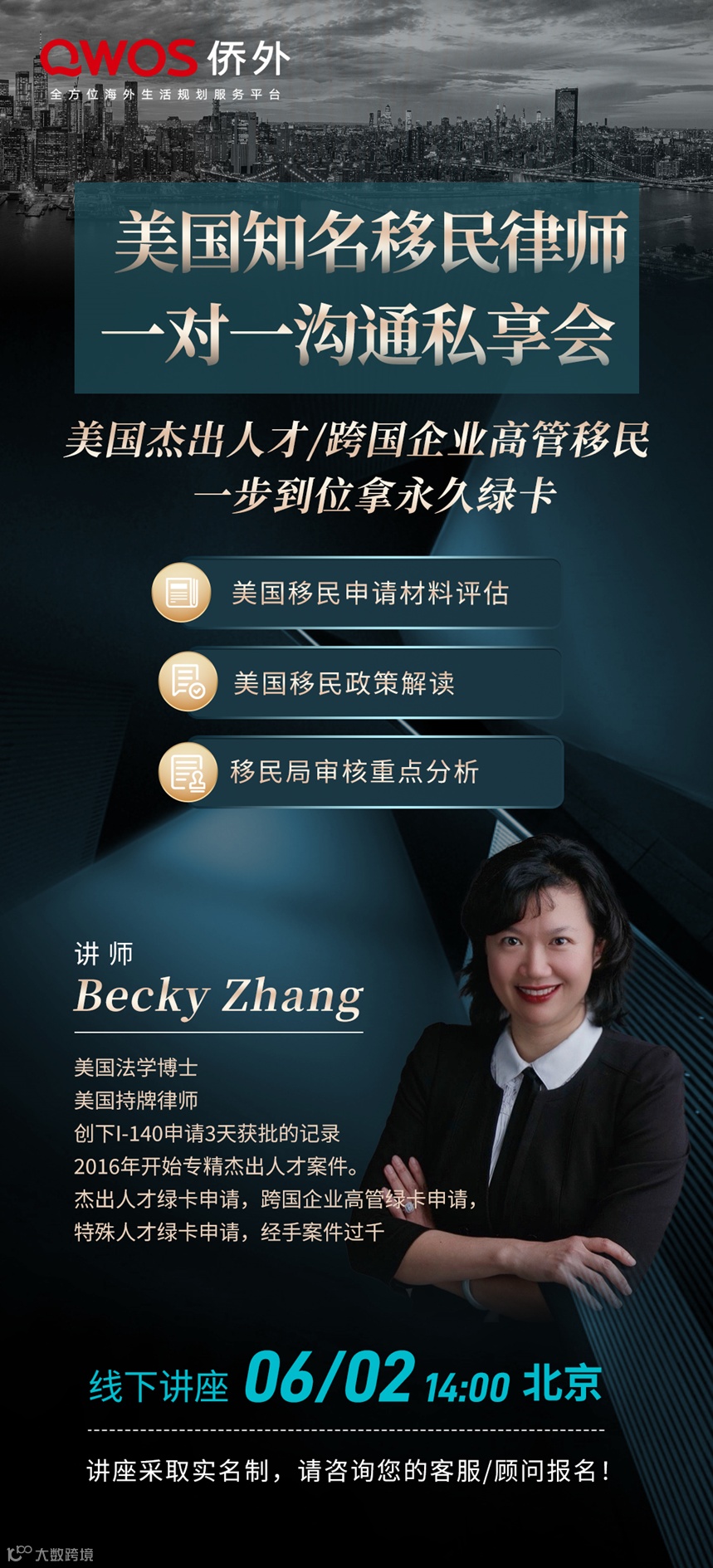 6月2日,我们也将举办一场美国EB-1A、EB-1C的相关线下活动,邀请美国资深律师详细为您介绍美国移民的方方面面,活动名额有限,先到先得,快联系您的专属顾问、客服报名参加吧!