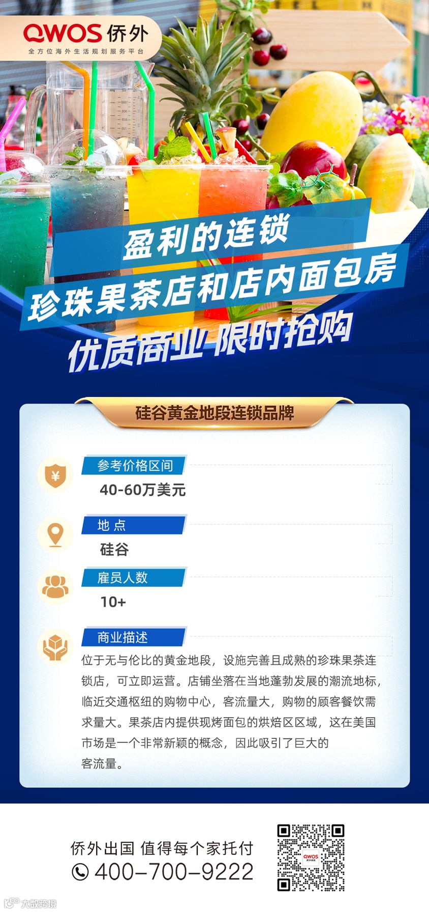 我们也为投资者甄选了位于湾区黄金地段的优质珍珠奶茶店,设施完善且成熟,可立即运营。店铺坐落在湾区蓬勃发展的潮流地标,临近交通枢纽的购物中心,客流量大,购物的顾客餐饮需求量大。果茶店内提供现烤面包的烘焙区区域,这在美国市场是一个非常新颖的概念,因此吸引了巨大的客流量。