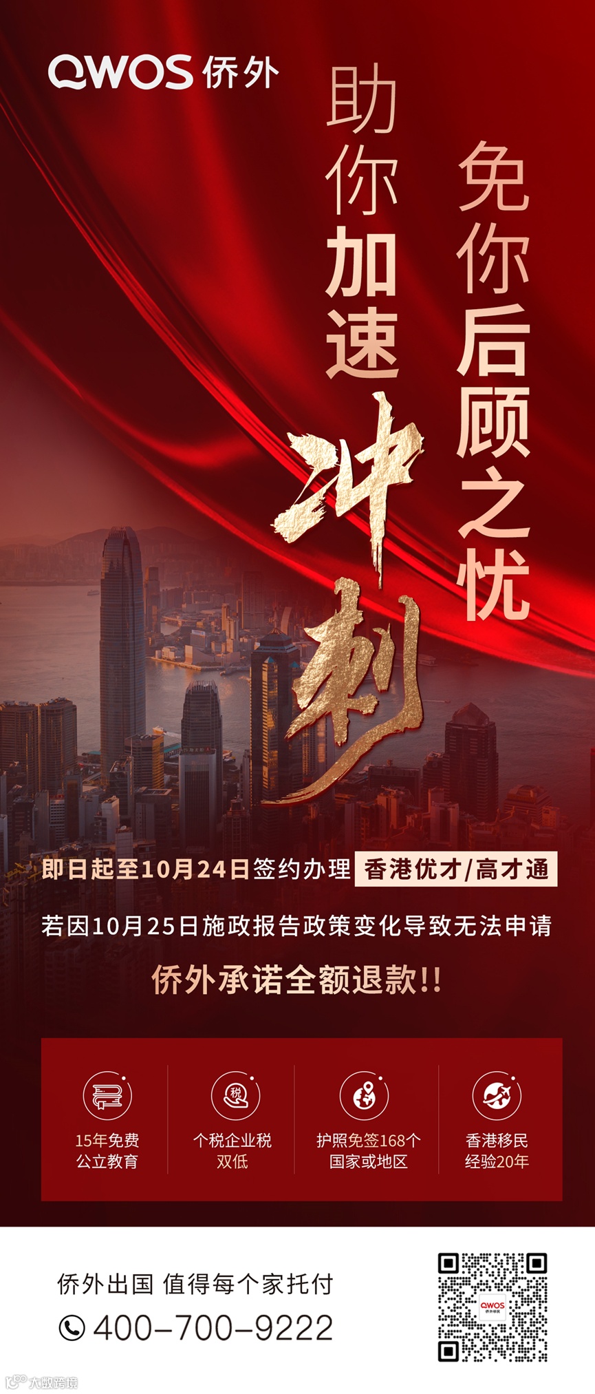 为了您能赶在10月25日之前“上车”,侨外出国也将全力以赴帮您冲刺,我们也郑重承诺,即日起至10月24日签约办理香港优才/高才通的朋友,若因10月25日施政报告政策变化导致无法申请,侨外将全额退款!