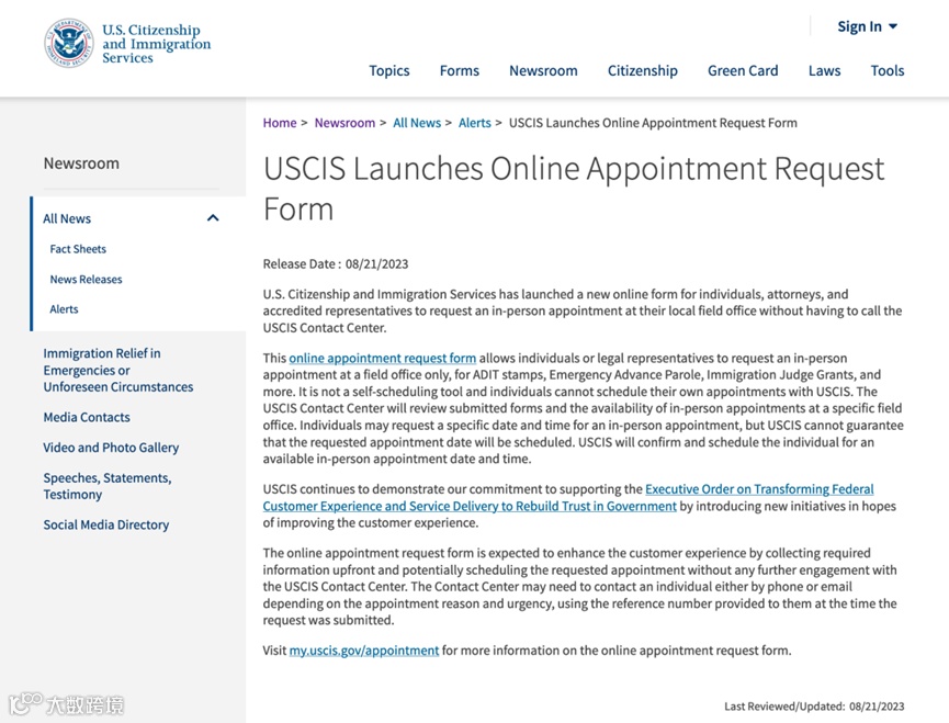 近日,美国移民局推出了一份新的在线表格,这份在线申请表格适用于个人、律师以及符合资格的代理人,可以直接向移民局地方办事处预约时间处理上述事务,而无需再致电美国移民局联络中心。