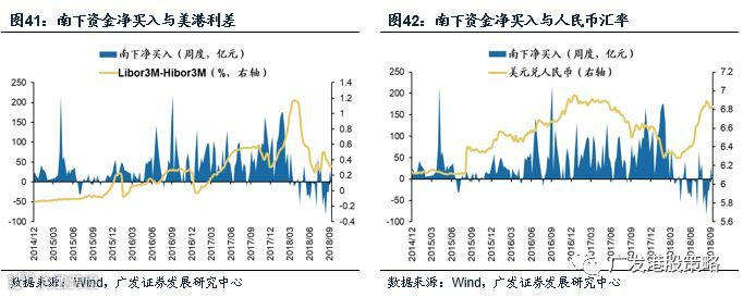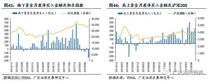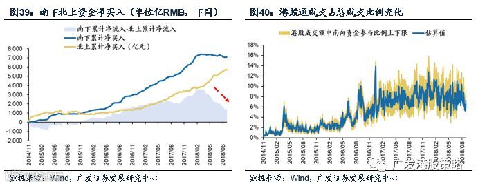第二,香港本地机构和外资对中国经济增长的远景,较内资更为乐观,互联互通资金“南冷北热”即是最好的验证。6月份以来,AH股均出现不同程度的下跌,但资金流向截然不同,北上资金更加乐观,南下资金则较为悲观,整体体现为“南冷北热”(图39)。“南冷”的逻辑较易理解,一方面在于汇率过快贬值导致业绩预期下调;另一方面在于港股对贸易战风险敞口较大。至于“北热”的逻辑,我们认为是体现为至少两个中长期层面的原因:其一,对中国经济增长和转型前景,外资反而比中资要更加乐观,尤其对于去杠杆,外资的解读更加正面;其二,A股国际化背景下,资本市场开放带来长线配置机遇,外资有望不断提高A股配置比例。