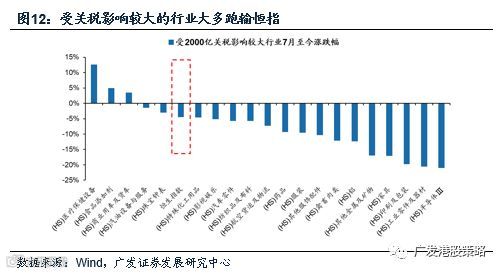 若最终征税落地好于预期,前期受贸易战利空压制的行业可能短期受益。7月至今,恒生指数下跌4.4%,而在涉及2000亿美元关税,且对美出口占比较高的20个恒生三级行业中,仅有5个行业跑赢恒指。在中美贸易战出现缓和迹象后,前期受贸易战利空压制的行业短期内弹性更好,如汽车零件、医疗设备、电讯、半导体等。