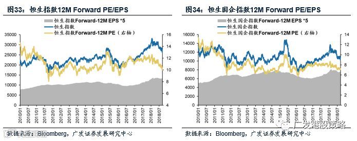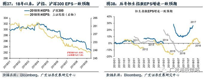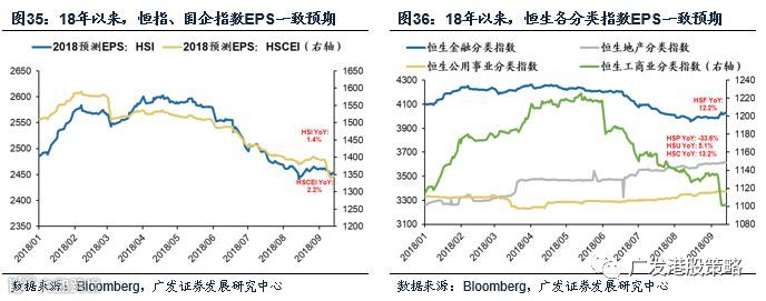 本周(9.10-9.14)彭博对于恒生指数和国企指数18年EPS一致预期增速分别下调至1.4%和2.2%,其中国企指数一致预期EPS下调明显。