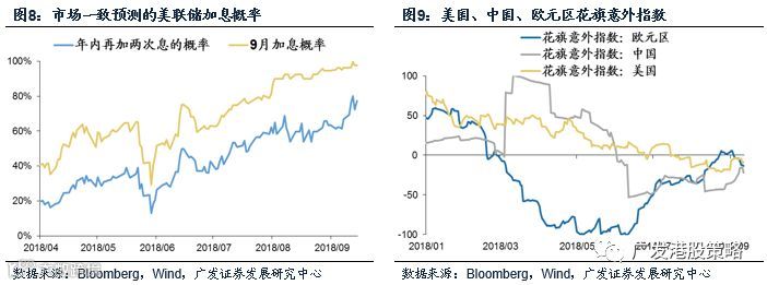 第二,对于无风险收益率的判断,投资者坚信美债收益率将继续上行,但对中国长端国债收益率的预期相对紊乱。由于港股市场既是“离岸市场”,又是“在岸市场”,因此需同时关注中国和美国无风险收益率的变化。我们判断,美联储加息预期下美国10年期国债收益率趋于上行(年内再加两次息的概率仍有77%,如图8),而人民币贬值压力下中国10年期国债收益率短期内下行的概率也在降低。