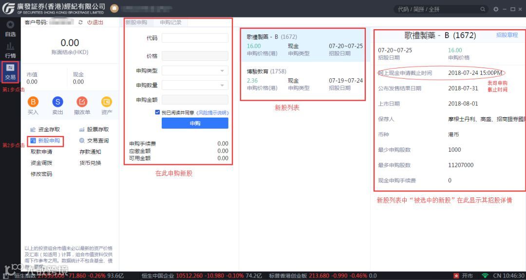 指引一:认识PC端“新股申购”交易界面