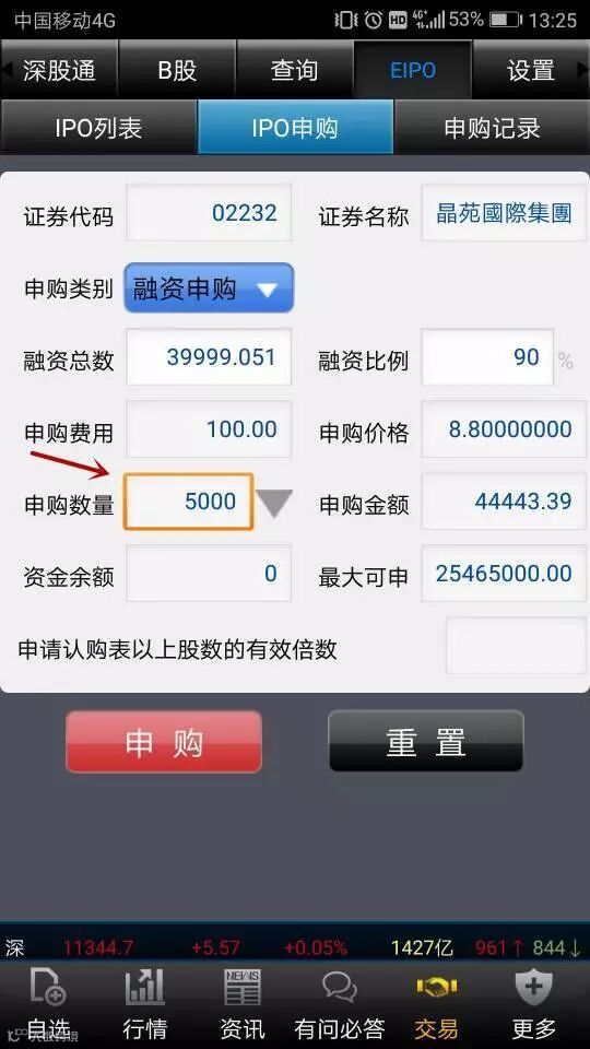 填写完融资比例后,需要填写申购数量,可点击方框后的箭头图表选择您所需的数量,点击申购按键即可。