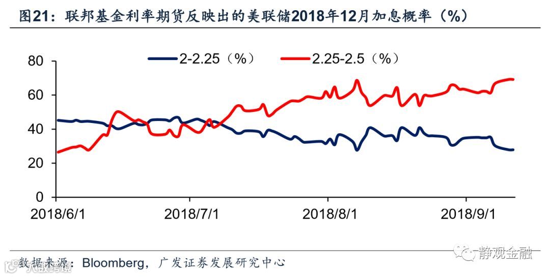 此外,图21所示,目前美国联邦基金利率期货反映出年内再加息两次的概率已经超过70%;图22所示,2019年美国基准利率升至2.5-2.75%以及2.75-3.00%的概率也分别达到35.1%及28.2%。由于联邦基金利率期货反映出的加息概率为累计概率,因此未来一年内美联储或仍有4次左右的加息操作。
