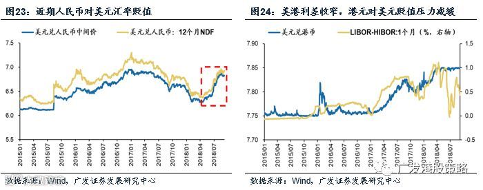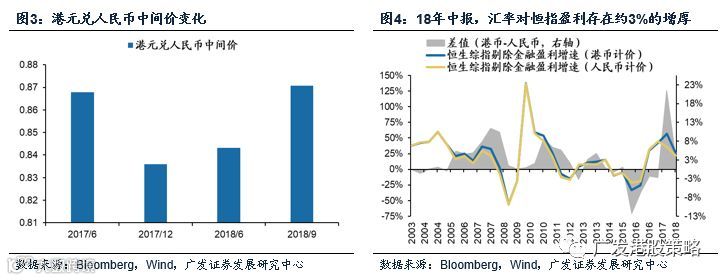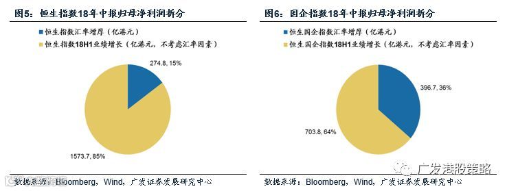 我们以汇率风险敞口最显著的国企指数成份股为例,2018年中报以港币计价的实际归母净利润增长中,汇率增厚的影响略高于1/3;若以恒生指数为例,汇率因素对港币计价的归母净利增长增厚约15%,汇率因素对恒指盈利的影响要弱于恒生国企指数。