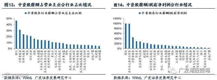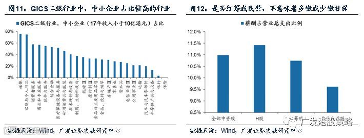 对于港股上市中资公司而言,如何量化社保征缴改革的影响?征缴新规下上市公司可能需要多缴纳社保,将增加用工成本、减少税前利润。由于港股上市公司大多不披露社保缴纳数据,因而无法通过应该缴纳的社保额和实际缴纳的社保额之差来测算上市公司净利润可能面临的冲击。我们采取公布2017年员工薪酬的560家中资股作为样本,重点分析社保征缴改革对中资股的行业影响,主要从四个维度入手:中小企业占比情况、是否红筹/民营、员工薪酬占总成本比例、员工薪酬占税前净利润比例,主要结论如下: