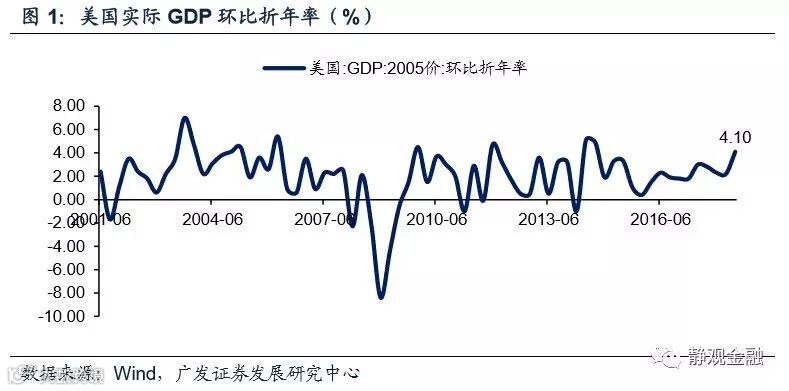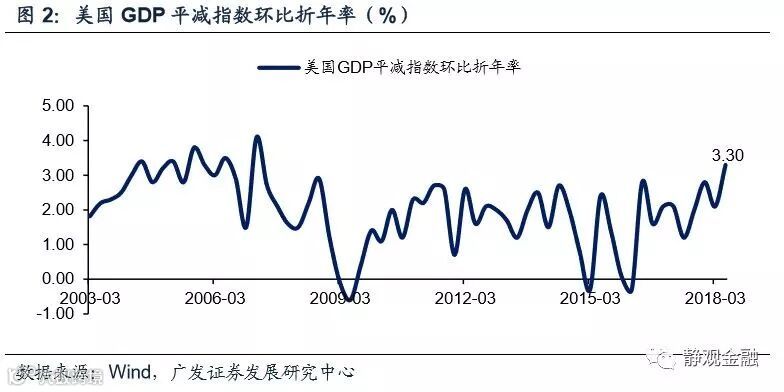 7月27日,美国经济分析局(BEA)公布了二季度美国经济数据:实际GDP环比折年率为4.1%,高于前值2.2%,并且刷新2014年三季度以来的新高;名义GDP环比折年率7.4%,前值4.3%;GDP平减指数环比折年率3.3%,前值2.1%;实际GDP同比2.85%,符合我们在报告《美国:资产估值拐点与经济拐点探讨》(2018年2月13日)中的预估。