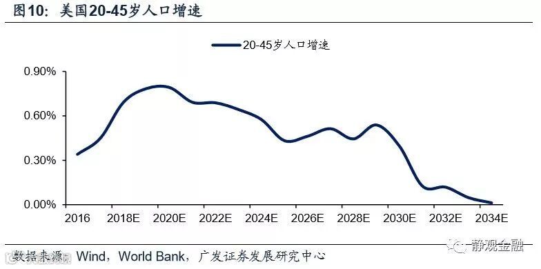 第一、 人口结构。尽管美国20-45岁中青年龄段人口增速的峰值出现在2020年,但2019-2020年增速斜率放缓;