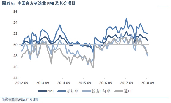 中国9 月官方制造业PMI 报50.8,低于前值51.3。从分类指数看,制造业9 月份原材料库存指数下滑0.9 至47.8,从业人员指数下滑1.1 至48.3,均持续位于枯荣线以下。受贸易战升级影响,需求疲软,新出口订单指数和进口指数分别为48 和48.5,较8月下降1.4 和0.6,均为2018 年内低点。PMI 快速下降,显示贸易环境恶化带来的增长不确定性增加,预计经济面临持续下行压力,未来稳增长政策或加码。