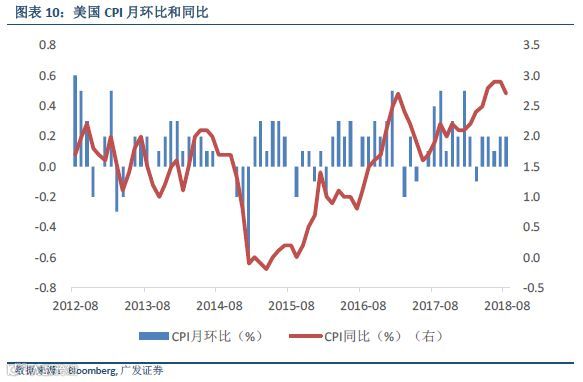 美国9 月CPI 数据将在10 月11 日公布,8 月CPI 同比为2.7%,不及预期的2.8%及前值的2.9%,9 月市场预期为2.5%。8 月CPI 月环比为0.2%,9 月市场预期与前值持平。CPI 的高低将会对美联储加息进程和国债利率产生重大的影响。